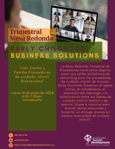 El objetivo principal de nuestra reunión de mesa redonda trimestral es crear una plataforma donde proveedores como usted puedan establecer contactos y conectarse con colegas profesionales, compartir y obtener apoyo a través de experiencias compartidas, explorar oportunidades de autodefensa y liderazgo, y fomentar la colaboración dentro del sector empresarial de la primera infancia. . Creemos que este encuentro será una excelente oportunidad para que crezcas tanto personal como profesionalmente. Su participación es muy valorada y esperamos que se una a nosotros. No dude en comunicarse si tiene alguna pregunta o necesita más información. Anticipamos una discusión productiva y enriquecedora en nuestra próxima Mesa Redonda.
